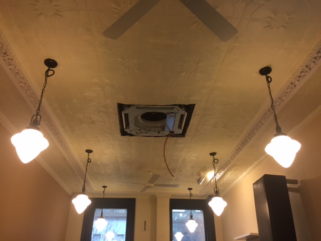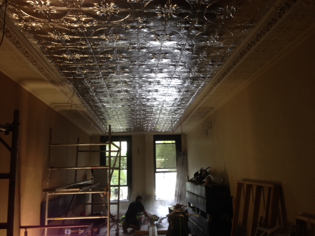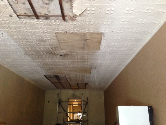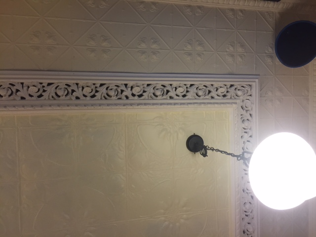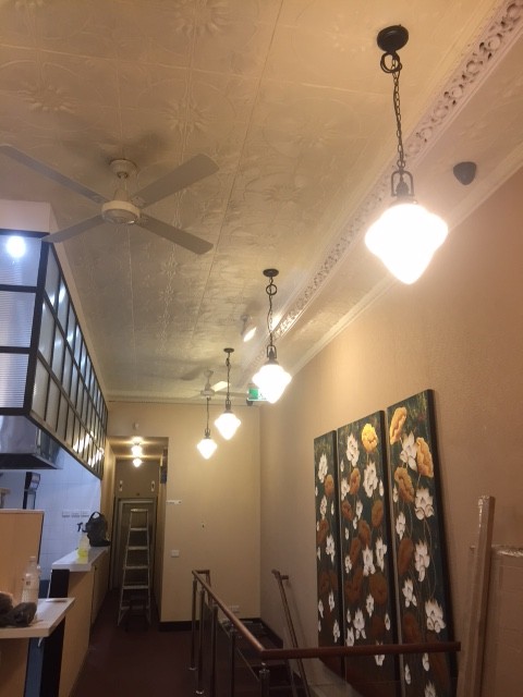 These photos show the before and after of a damaged pressed metal ceiling in Ghin Khao restaurant in Swanston Street, Melbourne. Justin managed to save some of the original ceiling, and replaced the damaged panels with another pattern. The two are demarcated by an ornamental plaster freize.
